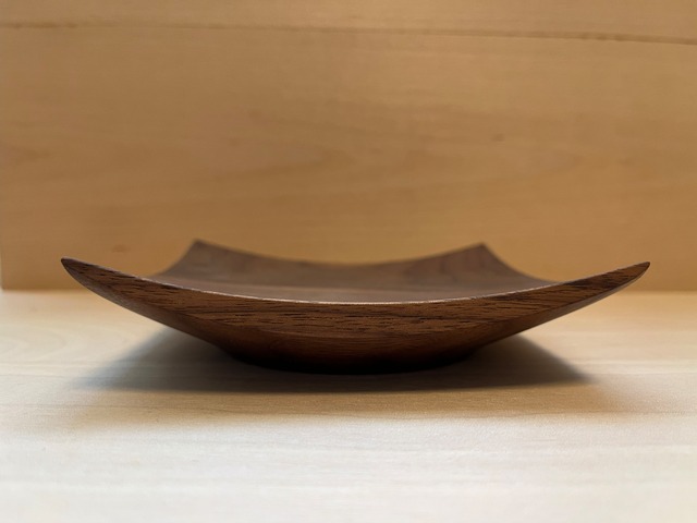 サイズ:約☐125mm×30mm 樹種:ウォルナット(北米産) ●ウォルナット:はっきりとした大きなやさしい木目が特徴的で、深みのある紫を帯びた茶色、節の近くの材は大理石のような杢のでる樹種です。家具などにも用いられる材で素直な材です。 ※木目は自然のものですので、世界にひとつ唯一無二です。 木目は写真と異なる場合があります、ご了承ください。 デザイン:平皿の形状は、外形は四角だけれど丸く穏やかに窪んでいる不思議なかたちです。ふちは小さく角をとっていてシャープなフォルム。木だけれどふわりとした印象で、デザートを盛ったり、取り皿として最適です。4つくっつけると波打った大きなお皿のようになります。 加工法:木工旋盤による手作業で加工し、仕上げています。木材を丁寧に削り、木が持つ温かみを残しつつ、使い心地の良い器に仕上げています。 塗装:tatara撥水セラミックという塗料を用いたナチュラル仕上げです。木の表情や質感はそのままに、強力な撥水性・防水性によって水分をシャットアウトして、永くご愛用いただける優れた塗料です。人体に取り込んでも問題のない自然素材で作られ、食品安全基準をクリアしています。表面に塗膜を作らずに、高い浸透性で木の繊維の奥深くに染み込んで硬化する塗料であるため、永きのご使用による、表面の荒れや毛羽立ちの際は、サンドペーパーで研磨したのち同じ塗料を塗布することでメンテナンスが容易なのも利点です。 この平皿は、和食や洋食を問わず幅広い料理に対応できるデザインとなっており、日常使いから特別な 宴席 まで多彩なシーンで活躍します。お気に入りの皿として、あなたの食卓に彩りを加えることでしょう。 注1)ご使用後は水につけ置きや食洗器は避けていただき、中性洗剤で洗ったあと、水気を拭き取ってから自然乾燥していただけますと永く美しい状態を保つことができます。
