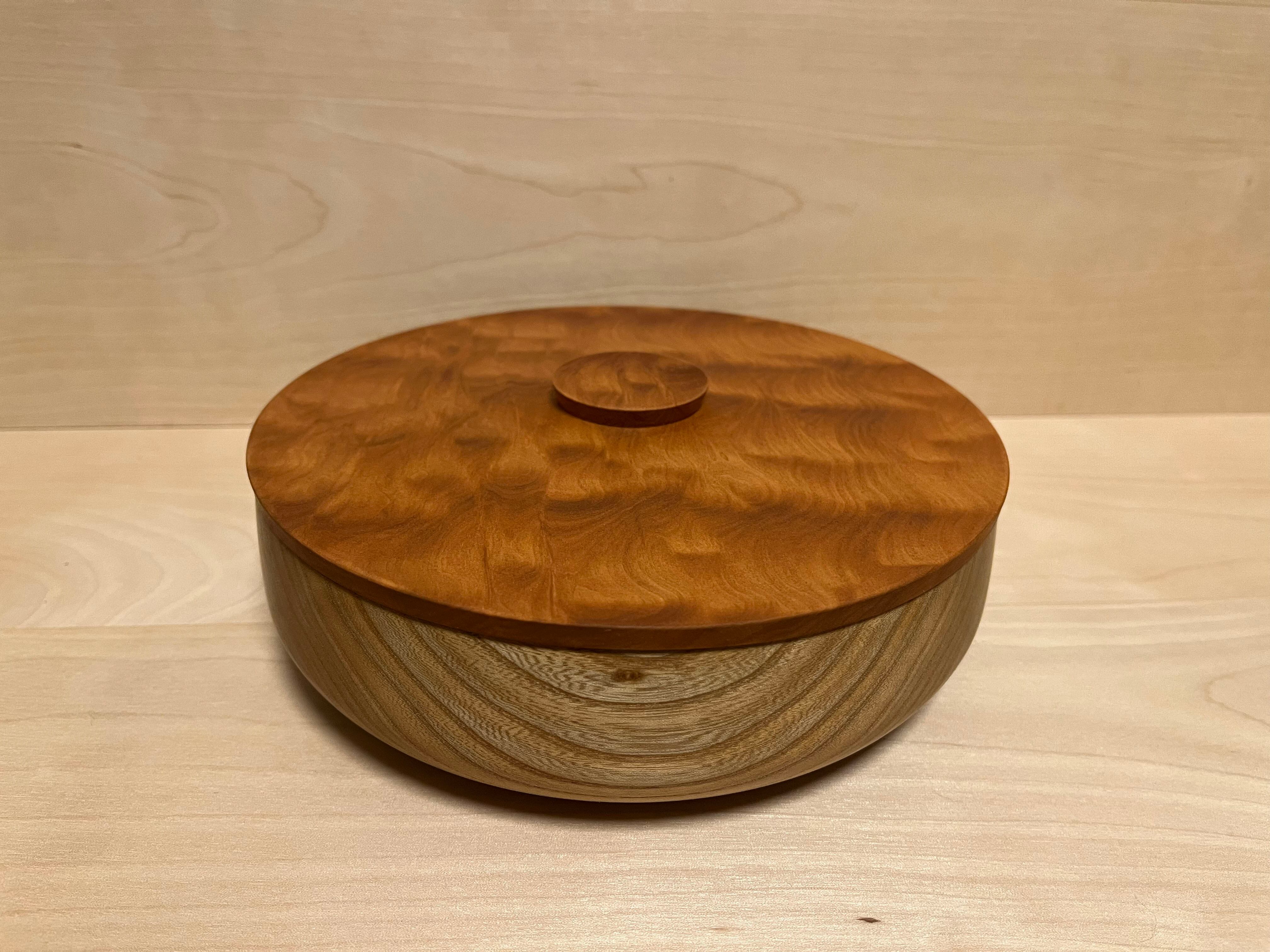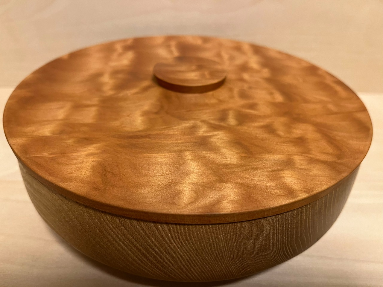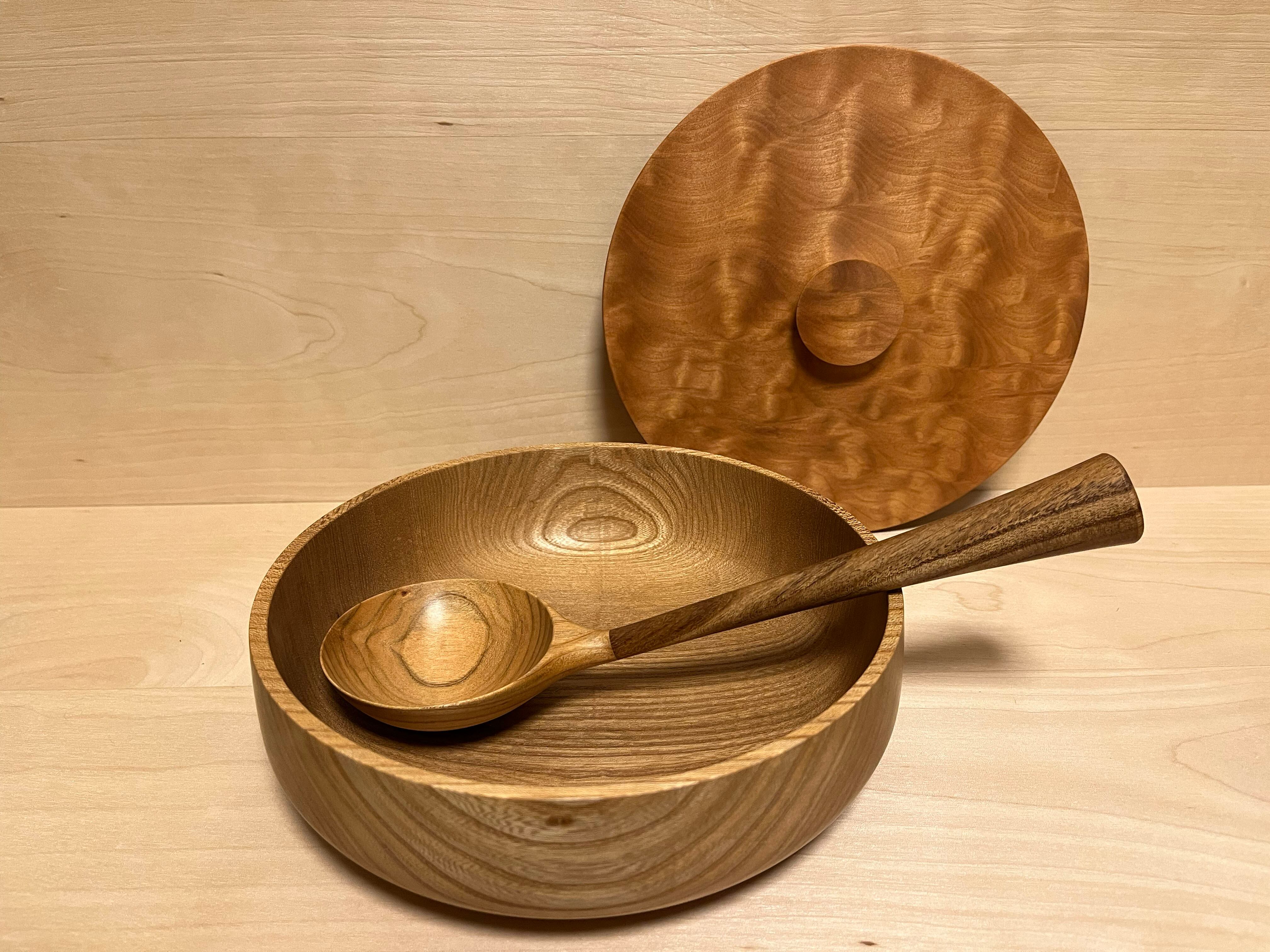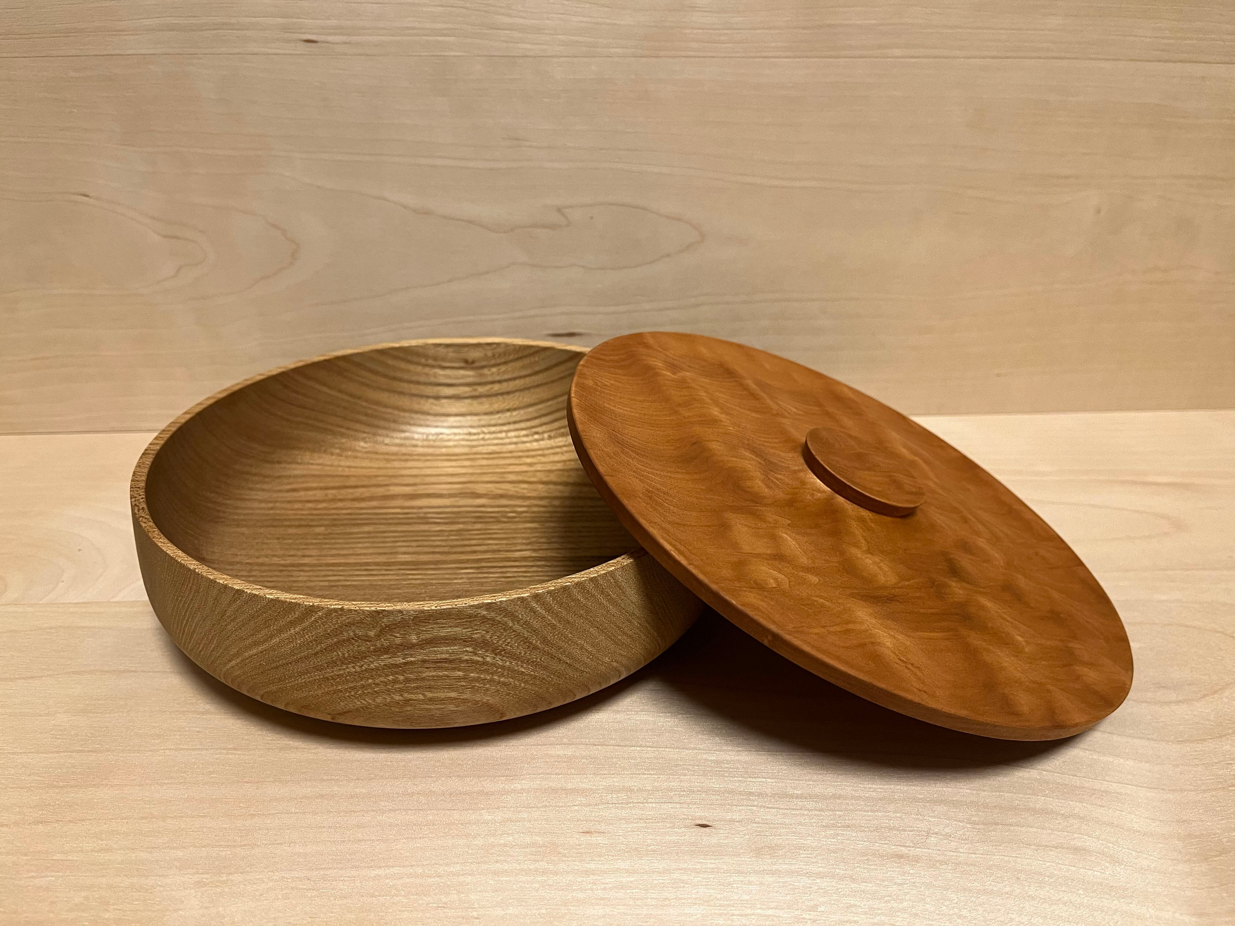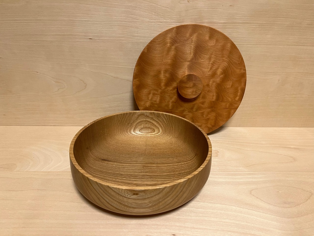 デザイン:深皿の形状は、底からサイドにかけてゆったりした曲線とシャープなエッジの効いたコロッとしたかたち。ふたはきらきらとした水面のような波状杢の美しい材を柿渋染めにて際立たせています。蓋を開けたときの楽しさや料理を乾燥から守る役割もあり、食卓に華やかさを添え、料理を引き立てるために最適です。比較的軽量で手に持ったときのバランスや、使いやすさにも配慮されています。